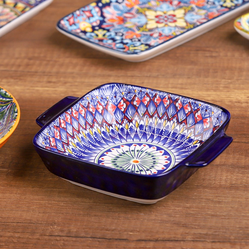 صحن تقديم بورسلان مزخرف ملوّن مربع بمقابض 7 إنش