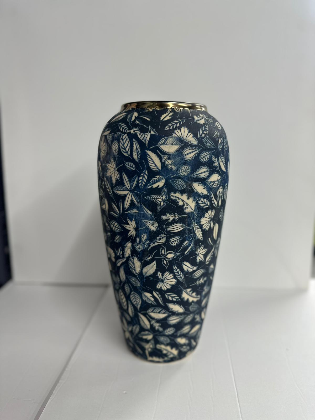 مزهرية سيراميك كحلية بنقشة أوراق وأزهار حجم كبير