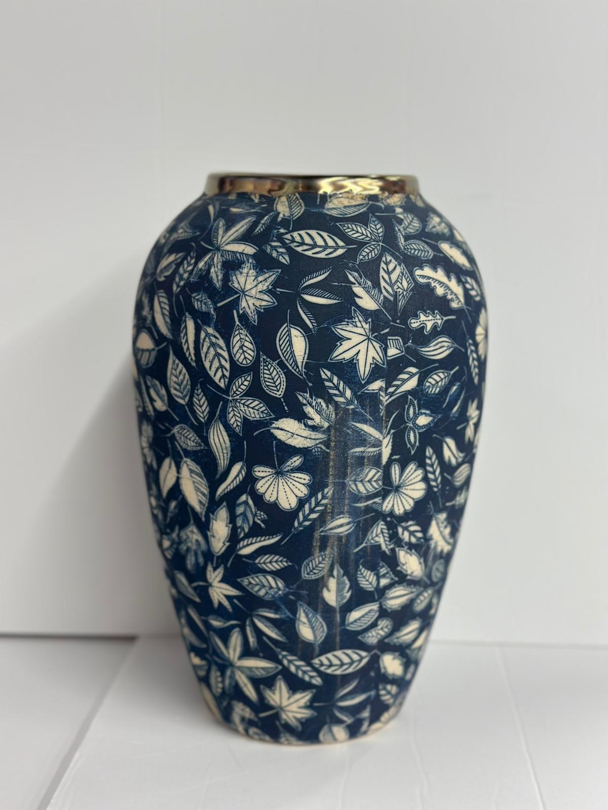 مزهرية سيراميك كحلية بنقشة أوراق وأزهار حجم وسط