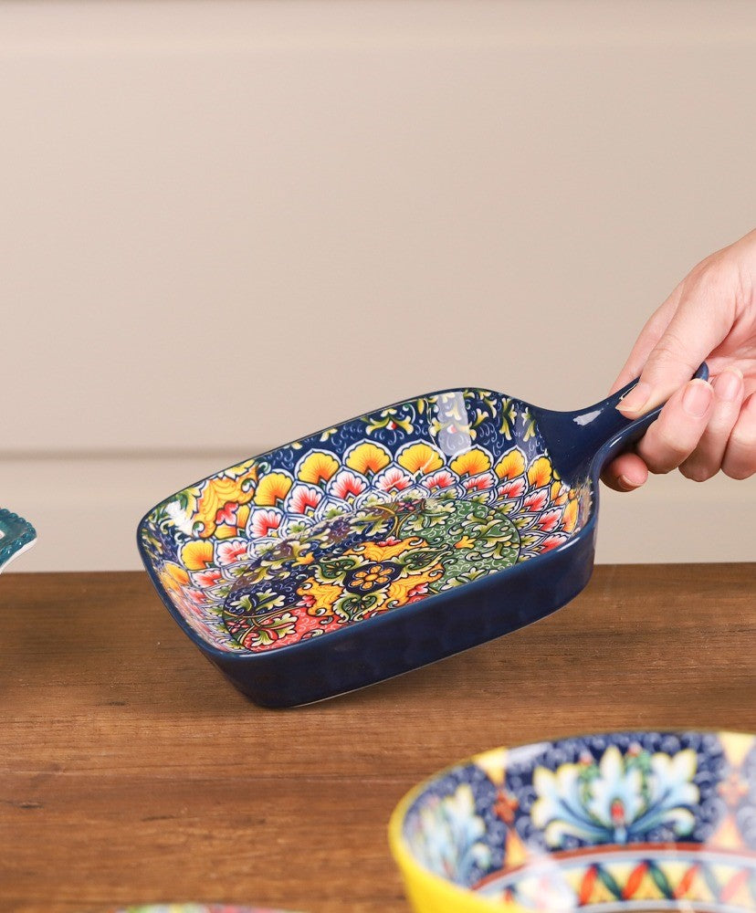صحن طعام بورسلان مزخرف ملوّن مربع بمقبض 7 إنش