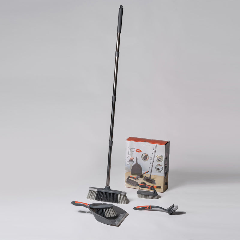 סט מברשות מלא הכולל מטאטא עם יעה ו-3 מברשות כלים לניקוי מגוון.